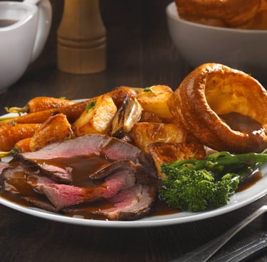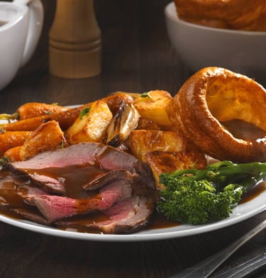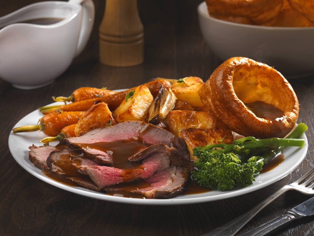 Solo los domingos. Carne asada (res, cerdo, cordero o pollo) servida con papas asadas, verduras, Yorkshire pudding (un tipo de pan horneado) y gravy.