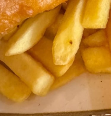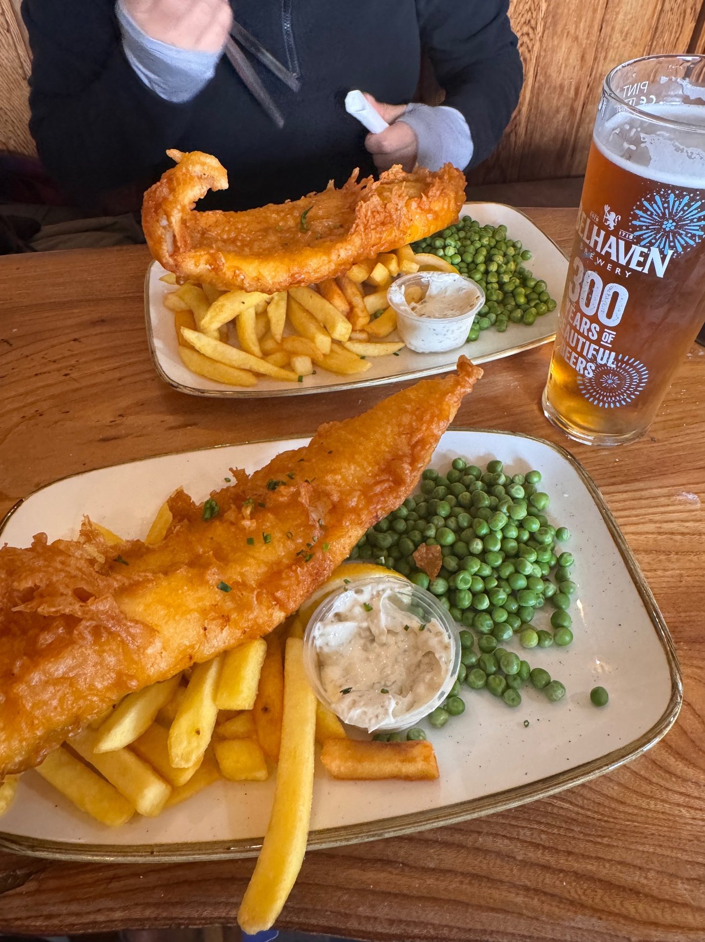 Pescado frito con papas fritas gruesas, servido con salsa tártara y acompañado de guisantes