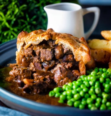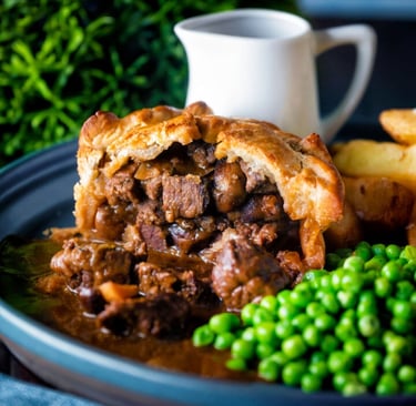 Pastel salado relleno (generalmente de carne) servido con puré de papas y guisantes