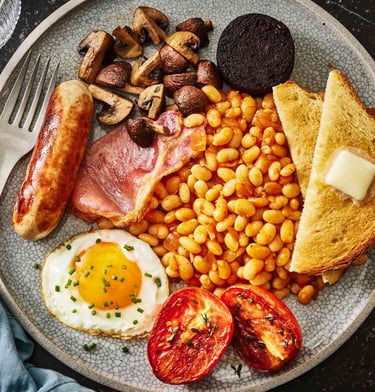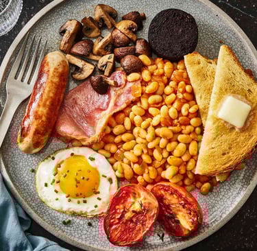 Desayuno abundante que incluye huevos, tocino, salchichas, frijoles horneados, champiñones, tomates y pan tostado.
