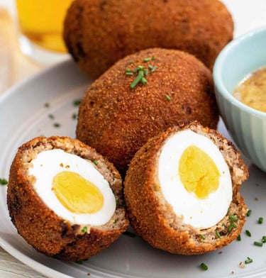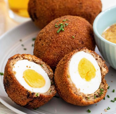 Un huevo hervido, cubierto en carne de salchicha molida, cubierto de pan rallado.